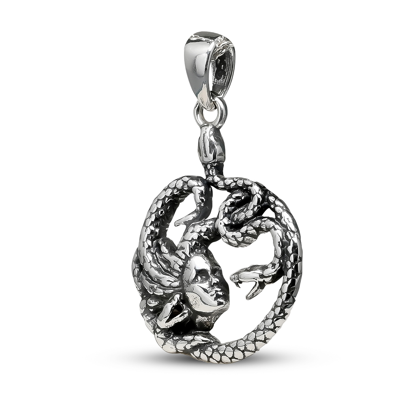 Este imponente colgante Medusa, tallado en plata fina 950, es una joya cargada de misticismo y fuerza simbólica. Su diseño muestra con gran detalle el icónico rostro de Medusa, con su mirada intensa y cabellera de serpientes, recreado con precisión artesanal y un acabado que realza cada curva y sombra del relieve.